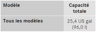 La capacité totale du réservoir de carburant peut varier en fonction de l'équipement du véhicule.