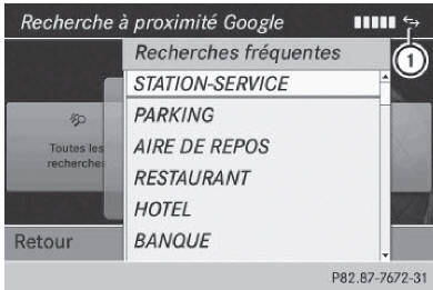 .La connexion internet est lancée. Une connexion internet active est reconnaissable au symbole 1. L'exemple montre le menu de la fonction de recherche à proximité avec google.