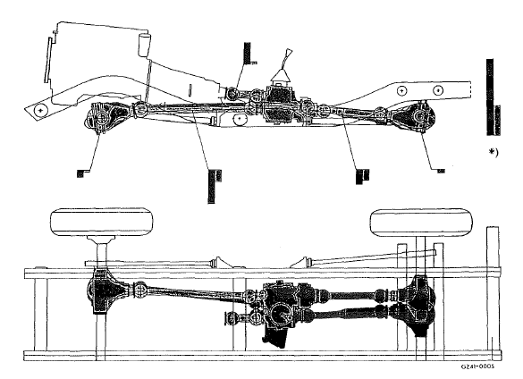 Nota: lors de la repose des arbres de transmission, observer les consignes suivantes: les pièces coulissantes des joints à cardan doivent être assemblées flèche sur flèche ou flèche sur graisseur.