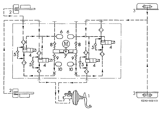 Pendant la phase de réduction de la pression, le liquide de frein s'écoule à travers ies électrovalves et les accumulateurs (6) dans la pompe de retour (7). Pour ne pas épuiser le volume du maître-cylindre de frein, la pompe de retour (7) délivre le liquide de frein contre la pression dans le maître-cylindre de frein. Pour l'insonorisation des pompes, chaque circuit de (rein comporte un silencieux (10). Ce cycle de régulation se répète tout le temps d'un (reinage régulé, jusqu'à relâchement de la pédale de frein ou jusqu'à peu avant l'arrêt du véhicule.
