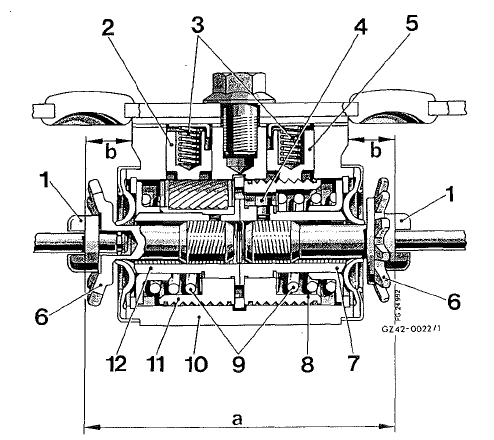 Lors de l'actionnement des freins en marche av, les douilles taraudées (7 et 12), la douille de réglage (8) et les vis de réglage (6) sont déplacées vers la droite. Si une certain course axiale est dépassée, l'axe de réglage (5) saute dans la dent suivante de la douille de réglage (8).